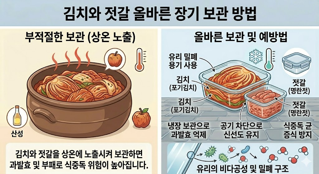 - 유리 및 스텐 용기 대체: 산도와 염도에 영향을 받지 않는 유리나 최고급 스테인리스(STS 304 등) 재질의 밀폐 용기 사용을 적극 권장합니다.