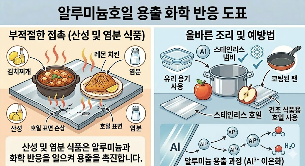 - 용출 기전: 김치, 식초, 토마토 등의 '산성 식품'이나 젓갈, 간장, 된장 등 염분이 높은 '짠 식품'이 알루미늄 호일과 닿으면 표면의 산화알루미늄 피막이 파괴되면서 알루미늄 이온(Al3+)이 음식물로 대량 용출됩니다.